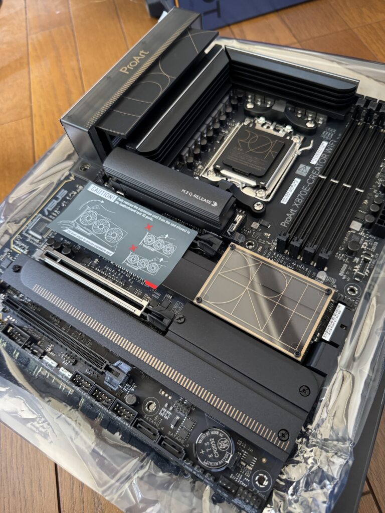 ASUSのクリエイター向けのマザーボードです。クリエイター向けの高性能CPUやGPUを搭載していても安定して電力供給などもできる高性能モデル。コレを買う前のマザーボードでは安定性が足りずに定期的に不具合が出ておりましたが、コレに変えてからはだいぶなくなりました。あとあと改善策なども見つけ、今では問題になっていた部分の修復もできていますし、もしかしたら買い替える必要はなかったのかもしれません。それでもまだ起きる不具合の中では前のものよりも耐えることが可能なのでやはり安定性を求めるならこれがいいと思います。SSDのスロット全箇所にクーラーとなるアルミ板がついてるので上位モデルだけはあって豪華。長期間使うならおすすめのマザーボードです。