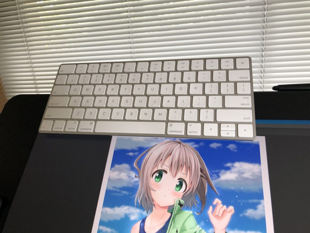 こちらは今まで使っていたMac用の75%キーボード。薄型・軽量で場所も取らないのでとても便利です。Windowsで使用する場合は有線接続になりますので、基本的には液タブについてるUSBと接続して使用します。Macでは無線もできますが、こちらも液タブに差しっぱなしなので有線で使用しております。