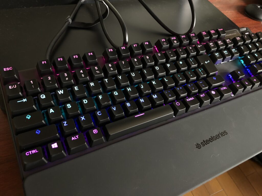 今回液タブに乗せるのはフルサイズキーボードのSteelSeries APEX PROになります。通常のキーボードにテンキーまで付いているために横に長いのが特徴。スイッチに関してもメカニカルスイッチを採用しているために厚みがあります。このキーボード自体はゲーミング向けなので普通は机の上に置いて使用するものです。