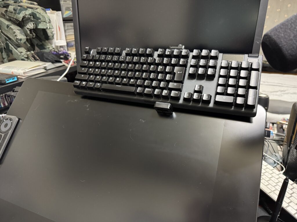 キーボードを挟み込むのもやや右に寄ってしまっているために、キーボード左側が液タブの画面上に落ちてきてしまっています。また、タブレットホルダーでしか固定できておらす、キーを入力すると上下に動いてしまい安定した入力ができませんでした。