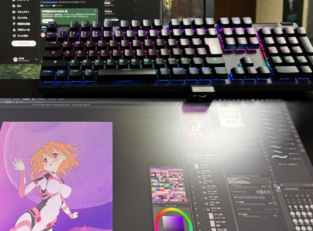というわけで液タブ上部にフルサイズのキーボードを設置することができました。75%キーボードでも問題ありませんが自分の使い方的にテンキーで数字を入力する方が作業しやすいため、これが最適解となっております。ただしキーボードの大型化によって奥のモニターの見える範囲が少なくなってしまったのがちょっと勿体ないかなと思います。結果としてYouTubeなどを見る時間が減り、作業効率は上がったのですが。