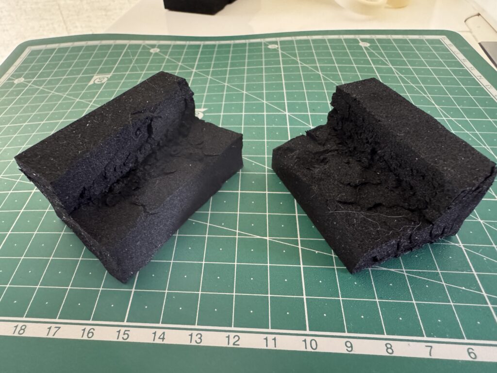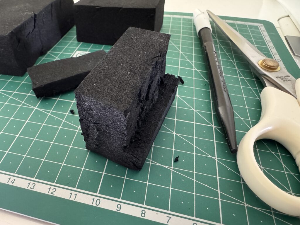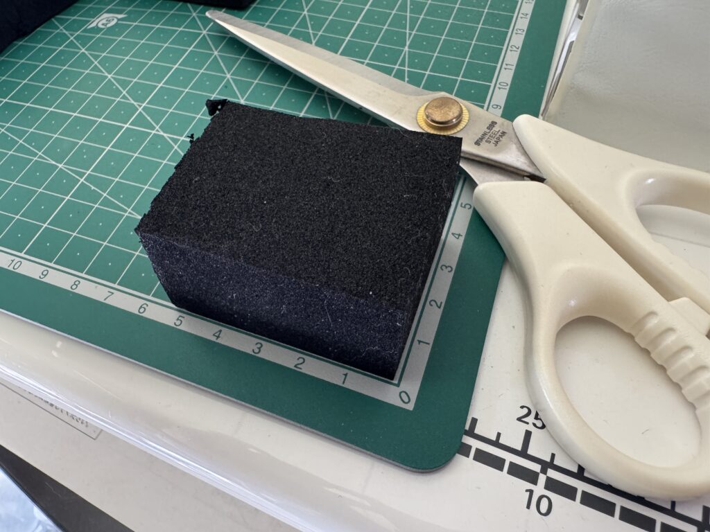 まずは切り取り。小さすぎたり薄すぎたりすると押した時の圧力で沈んで安定感がなくなってしまうのでそこそこの大きさにします。50mm x 40mmできりとりました。