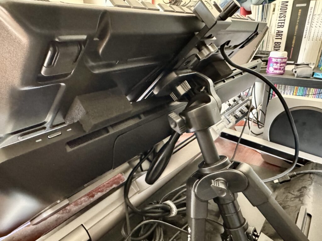 キーボードを挟んで仮置きしてみました。液タブスタンドの都合上、中央に三脚を設置することはできません。なのでやや右側によせて設置していますが、僕自身右利きなので右寄りにあった方が操作はしやすいです。