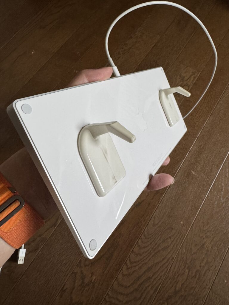裏はこんな感じ。100均で売っているフックをそのままペタリとキーボードに貼り付けます。あとはそのまま液タブの上におけば気軽にキーボードが使えるようになります。ただし貼り場所を間違えると画面を少し隠してしまうので、貼り場所は考えた方がいいです。また、画面が隠れるのを恐れて下に貼りすぎると、今度は安定感がなくなり脱落しやすくなりますので、液タブの角度を相談しながら設置しましょう。